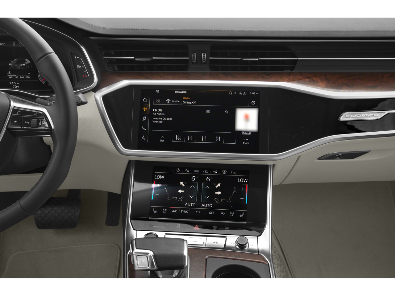 - Radio: MMI Navigation Plus -inc: 10.1" upper and 8.6" lower screen MMI touch response, Audi Connect CARE, PRIME & PLUS (limited time subscription), Audi music interface w/front and rear USB ports (data+charge), Audi smartphone interface (wired Android Auto and wireless Apple CarPlay), Audi sound system, Bluetooth® preparation for mobile phone and SiriusXM all access service (w/3-month trial subscription)